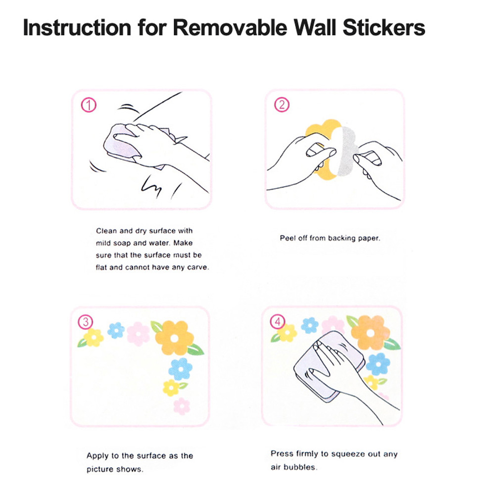 necesita para asegurarse de que la superficie esté limpia y seca antes de que pegue. Cualquier suciedad grasa o agua influirá en la perfección de la etiqueta. A veces puede haber algunas burbujas aparecen en etiquetas engomadas grandes, si esto sucede, quite la burbuja o pin a él. Cuando la pared está húmeda debido a algunas razones inesperadas, puede tener malas influencias en la etiqueta, cuando esto sucede, por favor, secar la pared y el adhesivo con un soplador de aire o simplemente pegarlo otra vez cuando la pared esté seca.