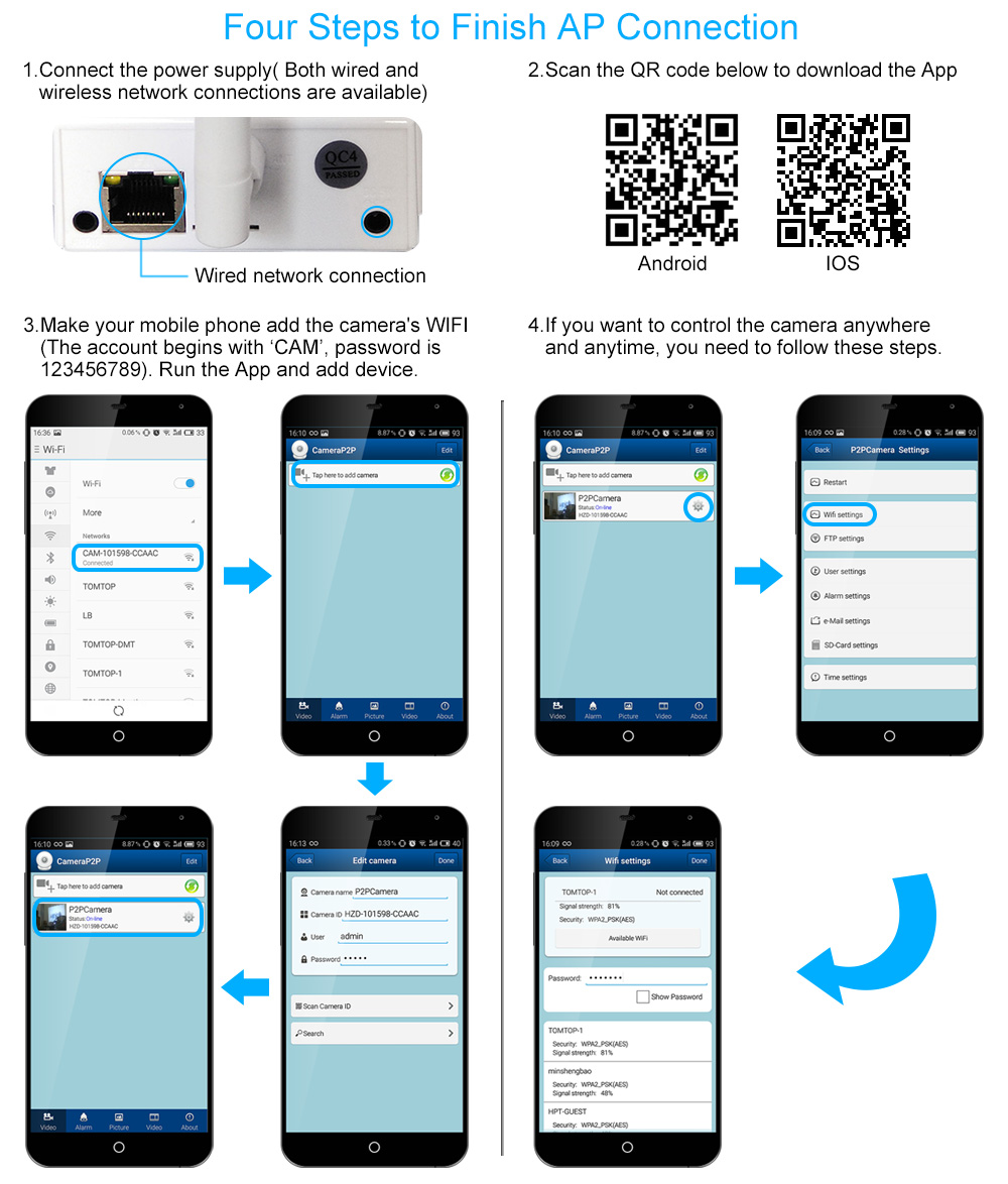 PnP | Plug & Play, 99% penetration rate, Easy to setup: 1, connect the network cable and power adapter. 2, install APP, scan UID code to add camera. 3, Click online camera to view the camera. |